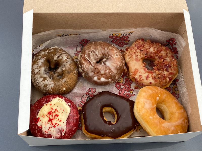 When I finally got inside, I had to order well before I could see the donut case. I was a little disappointed about that but I decided to put my fate in the hands of the girl who took my order. Before I could ask for her help, I told her this visit was my first time there… and before I could say anything more she got super excited and ran in to the kitchen. When she came back she screamed, “fast hands!” and threw a fresh and hot glazed donut at me. I had no idea what was happening and I caught the donut after it bounced off my chest. I asked her what just happened and she explained they have a tradition of throwing donuts at new customers as part of the fun of the visit. It was great!