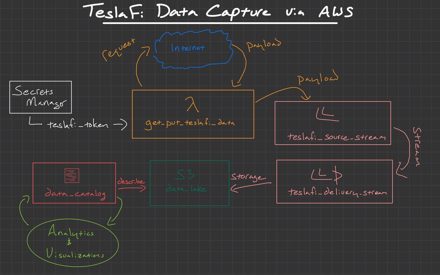 It was annoying me that I was drawing maps by downloading CSV files from TeslaFi. I figured since I had an extra morning, I would automate some of the Tesla data collection. This would enable me to query data directly in my drawing tools. I envisioned the following solution: