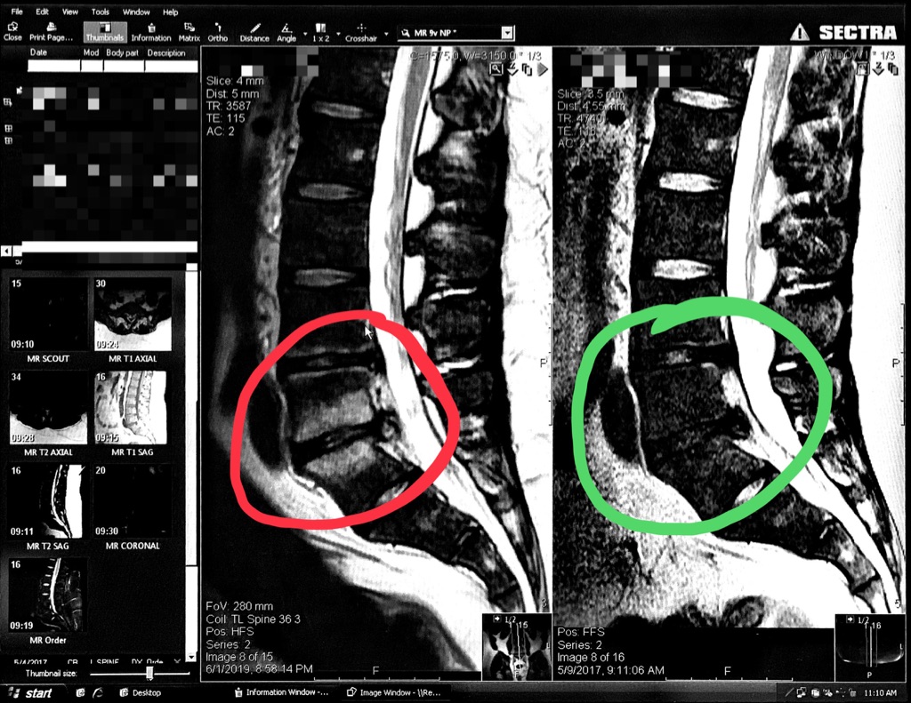 I herniated two discs in my spine back in 2008. Since then I have been in and out of doctors’ offices trying to manage it. There have been ups and downs but for the most part I learned to live with it. Things took a turn for the worse starting October 2018. I cannot describe exactly when it started but suddenly I was living a life of constant pain. Literally, I felt pain at all hours of the day - an absolutely terrible experience. Next thing I knew, I was cycling amongst nine different doctors trying to get a handle on what was wrong. I saw this image in June 2019: